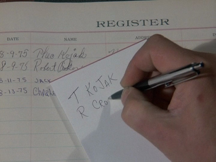 - Kojak signs the register in the motel at the bottom of the page, and later when Alley Oop sneaks in and copies this information, he looks at the bottom of the page. But in the next shot, Kojak and Crocker's names are at the top of the page. They signed in on 8-9-75, but below their names are two other people, Jack, who signed in on 3-11-75 and Charle[s], who signed in on 3-13-75.
