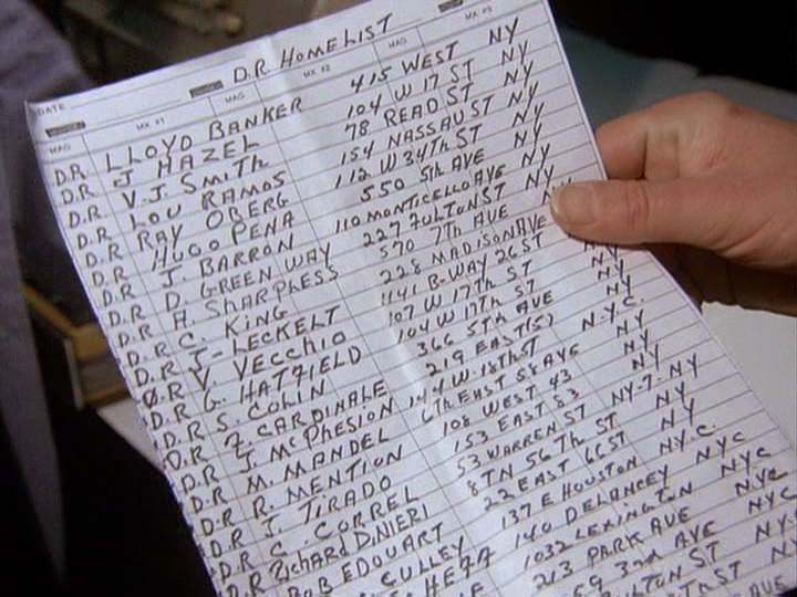 - Kojak, reading a list of Draper's students, says that Nystrom lives at 375 West 20th Street, but the sheet of paper containing his address says that it is 438 West 38th Street.